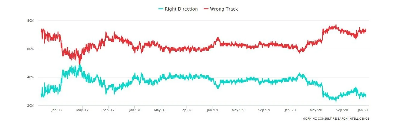 At the end of 2020, Morning Consult offered a summary of the year’s trends. Among the information shared was this chart tracing the share of adults who think the country is “moving in the right direction” (blue) versus “on the wrong track” (red).
