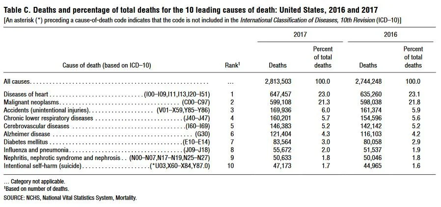 The best source for information on mortality in the US is the Center for Disease Control. And the CDC reports around 2.8 million Americans die each year. In a nation of 320-million, that amounts to 0.8% annual mortality. In other words, less than, but almost, one percent of the population dies each year. That overall death rate varies by age and region of the country and genders, and race, and income, and access to health care. But all together, the primary causes of death in America are consistent across years.